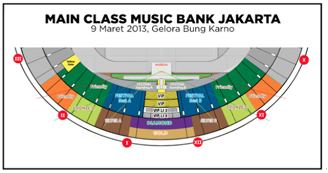Music bank akan digelar di jakarta nanti pada tanggal 9 maret 2013, akan menjadi konser yang besar dengan melibatkan kop idol yang super duper keren. Bagi kamu yang berencana menonton langsung KBS Msic bank Jakarta berikut denah/layout konser secara keseluruhan.